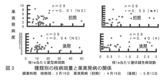 - 夏型枝病斑数と果実発病の相関は低く、潜伏越冬枝病斑の形成数と初期の果実発病(4月19日調査)との間には正の相関がみられるが、生育期の後半(5月13日調査)になるとその傾向は低下した(図3)。