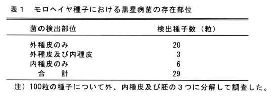 - モロヘイヤ黒星病菌(Cercospora corchori )による汚染種子を、通風式恒温器を用いて40℃で1日間予備乾燥し、続いて87.5℃で6日間乾熱処理する方法は、種子消毒法 として有効である。