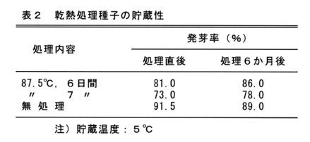- 87.5℃、6日間乾熱処理後の種子を、5℃で6か月間貯蔵しても発芽率の低下は認められない(表2)。