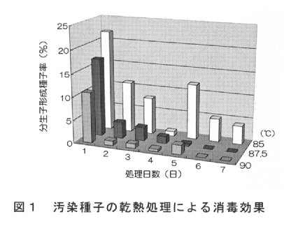 - 汚染種子を通風式恒温器(温度制御精度±0.5℃)を用いて40℃、1日間の予備乾燥後、87.5又は90℃で6~7日間乾熱処理すると本菌は検出されず、高い種子消毒効果が認められる(図1)。