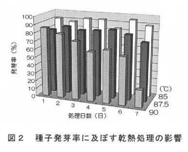 - 乾熱処理種子の発芽率は、無処理区の約90%に対して87.5℃の6日間処理でやや低下し、90℃処理では60%以下に低下する(図2)。