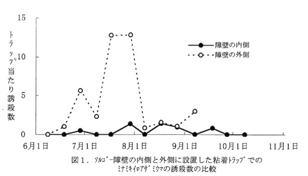 - 露地ナス圃場の周囲へ幅約2mのベルト状に防風用ソルゴー(品種、ゴールドソルゴー)を4月下旬に播種して栽培すると、圃場内へのミナミキイロアザミウマ飛来を阻止する効果がある(図1)。