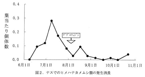 - ヒメハナカメムシ類の発生は6月中旬からみられ、8月中旬まで発生が多い(図2)。8月下旬以降ヒメハナカメムシ類の密度が低下し、ミナミキイロアザミウマの被害が増加するとクロルフェナピルフロアブルを散布して防除する(図3)。