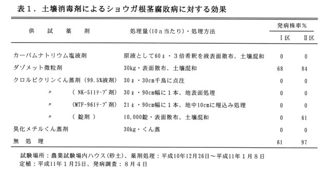 - ショウガ根茎腐敗病に対して、クロルピクリンくん蒸剤(99.5%液剤、NK-511テープ剤、MTF-961テープ剤)、カーバムナトリウム塩液剤(散布・土壌混和)は、臭化メチルと同等に発病を抑え、防除効果が高い(表1)。