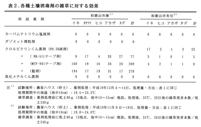 - 雑草に対して、クロルピクリンくん蒸剤は概して殺草効果は低いが、そのうちNK-511テープ剤は効果がやや優れた。カーバムナトリウム塩液剤(散布・土壌混和)及びダゾメット微粒剤は臭化メチルと同等に雑草の発生を抑え、防除効果が高い(表2)。