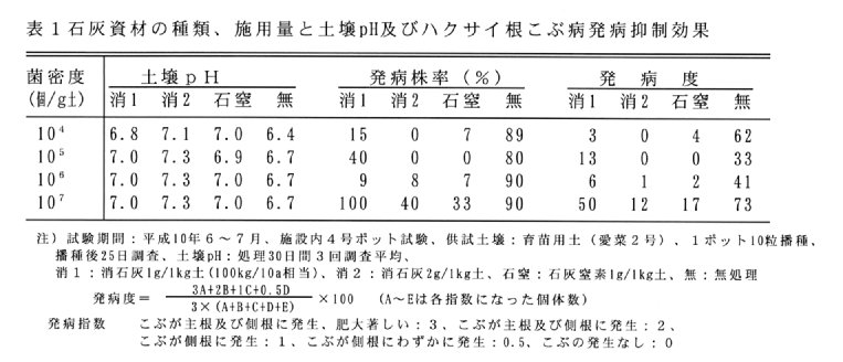 - 菌密度が104 ~107 個/g土の汚染土壌での土壌pHとハクサイ苗の発病調査では、石灰の種類にかかわらずpH7以上で発病を抑制するが、土壌菌密度107 個/g土で発病抑制効果は低下する(表1)。