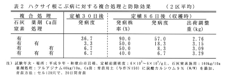 - 菌密度6×103 ~104 個/g土の圃場では、石灰窒素160kg/10aの施用に用土に炭酸カルシウムを重量比で9%添加した苗(以下Ca苗)の利用で発病株率、発病度が抑制され、安定生産が可能である。フルアジナム40kg/10aの薬剤処理はCa苗の利用とほぼ同等の防除効果である(表2)。