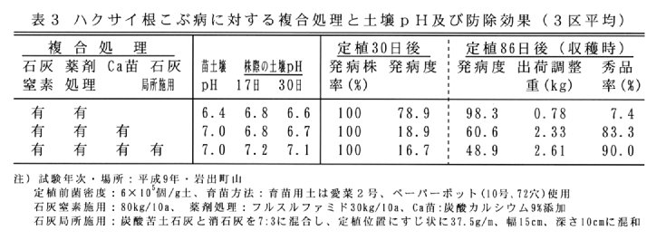 - 菌密度6×105 個/g土の圃場では、薬剤処理と石灰窒素施用を基本に、Ca苗を利用すると防除効果は向上し、定植時に消石灰と苦土石灰を7:3に混合した石灰を溝状に施用する(37.5g/m)局所施用を併用すると収量、秀品率はさらに向上する(表3)。
