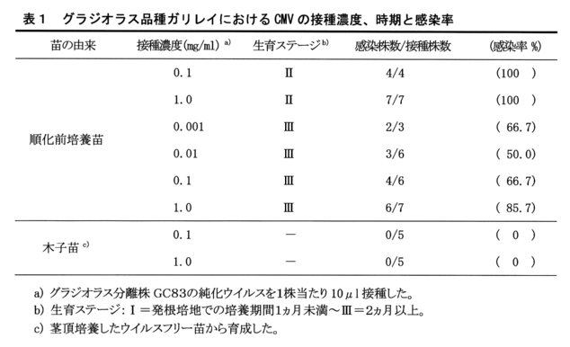 - CMVの接種は茎頂培養によってウイルスフリー化した順化前の培養中の幼苗に行う。発根培地における培養期間が2カ月未満の品種ガリレイでは、ウイルス濃度0.1~1mg/ml で100%の株が感染するが、木子から生長した幼苗は全く感染しない(表1)。