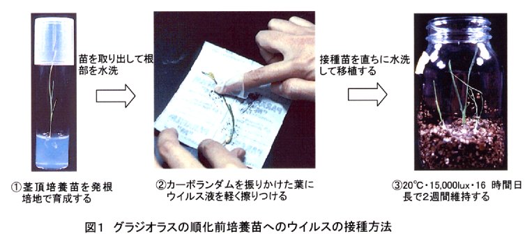 - グラジオラスでは木子や球茎から生長した苗へのウイルス接種が極めて困難であるが、茎頂培養によりウイルスフリー化した順化前の培養中の幼苗を利用するとウイルスの感染率が高まり、効率的に接種できる。