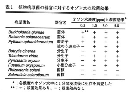 - オゾン水は植物病原菌に対して高い殺菌効果を有し、1ppmの濃度でBurlholderia glumae 、Ralstonia solanacearum の菌体、Pythium aphanidermatum の遊走子を、3ppmでBotrytis cinerea 、Tricoderma viride の分生子を1分以内に殺菌できる(表1)。