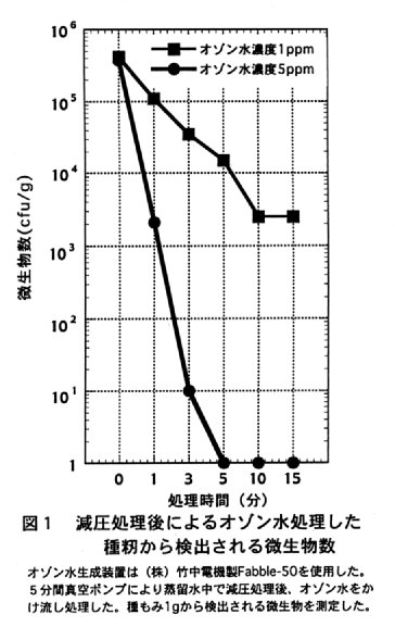 - オゾン水中で減圧処理後、1ppmのオゾン水で15分間かけ流し処理することで、水稲種子表面の微生物数を104 cfu /g以下に、さらに、5ppmでは、105 個以上の密度を減少させることができる(図1)。