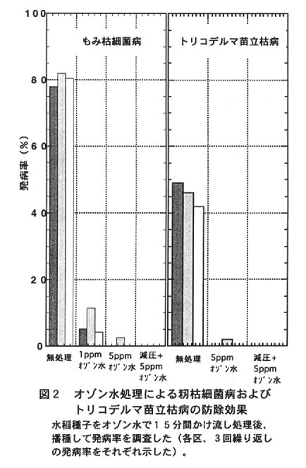 - 水稲トリコデルマ苗立枯病菌(種もみ接種)およびもみ枯細菌病の接種もみ(種もみ接種:減圧処理)を5ppmのオゾン水で15分間かけ流し処理したところ、いずれも発病が抑制される(図2)。