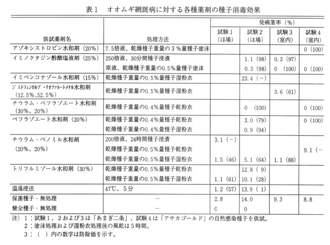 - 種子伝染による発病を防止するには、薬剤による種子消毒が有効である。有効な薬剤および処理方法は、アゾキシストロビン水和剤の 7.5倍液・3%量種子塗沫処理、イミノクタジン酢酸塩液剤の 250倍液・30分間種子浸漬処理、同剤原液の 0.5%量種子塗沫処理、チウラム・ペフラゾエート水和剤の 0.4%量種子乾粉衣処理、ペフラゾエート水和剤の 0.4%量種子粉衣処理(乾粉衣、湿粉衣)である。なお、チウラム・ベノミル水和剤、トリフルミゾール水和剤等の各処理および温湯浸法(47℃、5分)の防除効果はいずれも低い(表1)。