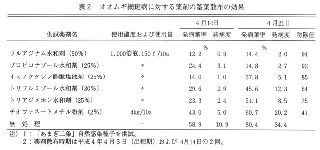 - 発病後の病勢進展を防止するには、出穂期以降の薬剤散布が有効である。有効な薬剤および処理方法は、フルアジナム水和剤、プロピコナゾール水和剤、イミノクタジン酢酸塩液剤等の 1,000倍液の茎葉散布である。なお、チオファネートメチル粉剤の効果は低い(表2)。