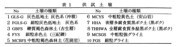 - 近畿中国地域の代表的な水田,畑地土壌10種類に根こぶ病菌を接種し,カブを連作して根こぶ病菌に高濃度に汚染された土壌(休眠胞子濃度107 ~108 個/風乾土壌1g)を作成し,ELISA(間接法)による根こぶ病菌休眠胞子検出の試料とした(表1)。