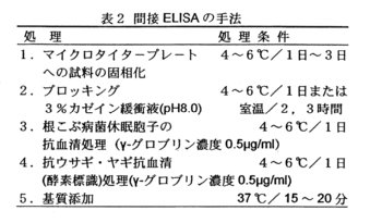 - ELISAの手法は検体を直接マイクロタイタープレートに固相化する方法が効果的であり,抗血清処理などを含む一連の作業を4~6℃の低温で長時間行うことにより,検出精度が高まり非特異反応を抑えることができる(表2)。
