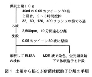 - 汚染土壌からの休眠胞子の分離は高橋・山口(1988)の方法が簡便かつ良好な結果が得られる。分離液はELISAのコーティング緩衝液で希釈して検体とする(図1)。