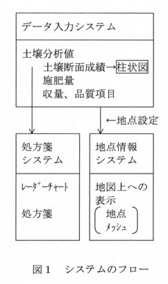 - C言語を用いてプログラムされたWindows95以上で動作するパソコンソフトであり、データ入力、処方箋、地点情報の各システムで構成される(図1)。