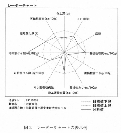 - 土壌理化学性の測定値から、土壌診断基準値をもとにレーダーチャートを作成し、有機物や土づくり肥料の施用などに関する土づくり対策の処方箋が作成できる(図2)。