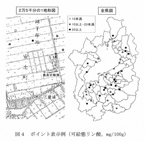 - 地点の位置情報を付加することにより、土壌養分状態や玄米蛋白含量を反映した表示(ポイント、100m~1kmメッシュ)が可能である。地図は任意の縮尺で作成され、各地域(普及センター管内、市町村等)の土づくり対策の推進に活用できる(図4)。
