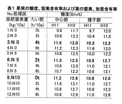 - 糖度は、施肥窒素量が10a当たり5kg以上の場合は、たい肥の施用量による差はない(表1)。