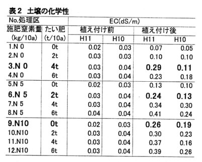 - EC値は、たい肥10a当たり2t施用で施肥窒素量5割削減の場合、たい肥10a当たり4t施用で無化学肥料の場合は、平成10年には0.11~0.13 dS/m、平成11年には、0.24~0.29 dS/mで、全量化学肥料による施肥窒素量10a当たり10kgの値とほぼ同程度の値になる(表2)。
