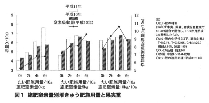 - スイカの収量は、おがくず牛糞入り醗酵たい肥(以下、たい肥と記す。)の施用量が10a当たり2tの場合は施肥窒素量が慣行の5割削減の5kgで、4tの場合は、無化学肥料で、全量化学肥料による窒素施用量が10kg並みのものができる(図1)。