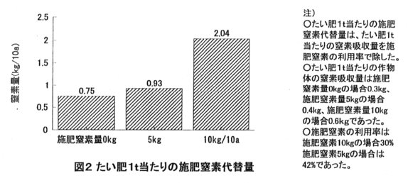 - 堆きゅう肥1t当たりの施肥窒素代替量は、化学肥料による窒素施用量が10a当たり0kg、5kg、10kgの場合に、それぞれ0.8kg、0.9kg、2.0kgに相当する(図2)。