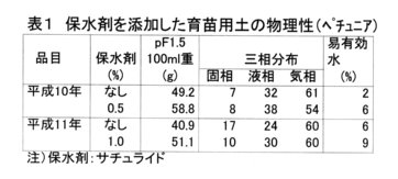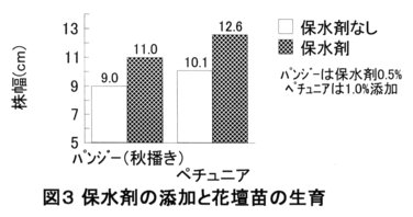 - 小型ポットに保水剤を用土の0.5~1.0%添加すると、易有効水量が増し、苗の生育が良好になる(図3、表1)。