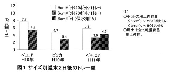 - 花壇苗の6㎝幅小型ポットは、慣行の9㎝ポット40個入りの1トレ-重が5~9kgであるのに対し、70個入り1トレ-重が3~5kgと軽量化できる。また、保水剤を容量比で用土の0.5~1.0%添加すると、苗の生育が良好になる。