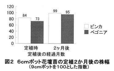 - 小型ポットで育苗したビンカ、ベゴニアの苗は、定植時には慣行の9㎝ポットと比較して70~80%であったが、2か月後には、ほぼ慣行並みに生育する(図2)。