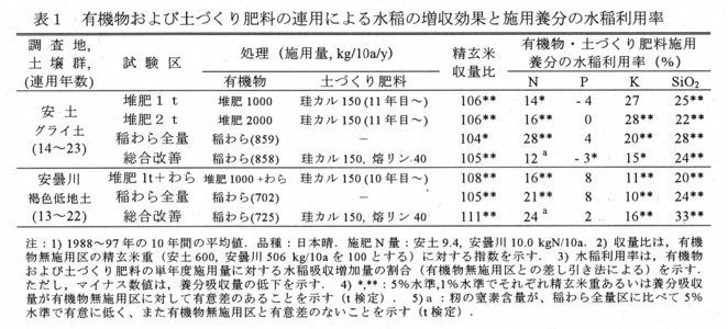 - 稲わらおよび土づくり肥料を約10~20年間連用すると、有機物無施用区(施肥N量:約10kg/10a)に比べて、半湿田で4~5%、乾田で5~11%の増収効果が認められる。塩基の溶脱が進みやすい乾田では、土づくり肥料の併用効果が高い(表1)。