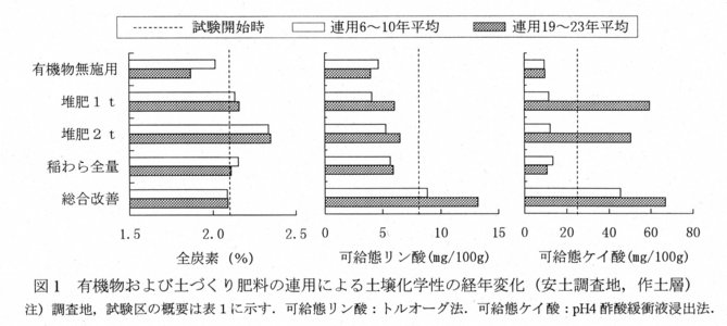 - 地域の土壌条件等に応じた地力増強対策は、持続的な農業生産とともに環境負荷軽減のために重要であり、それには土壌のちがいと有機物・土づくり肥料の連用効果を長期的に解析・評価する必要がある。