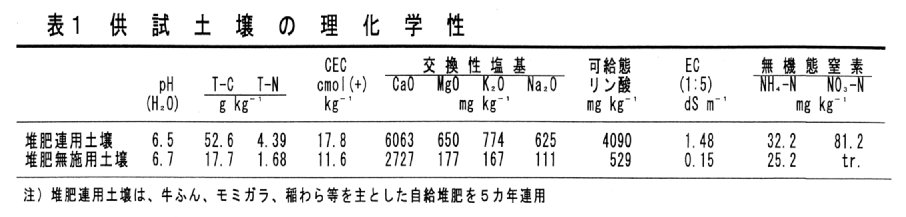 - 神戸市西区の施設軟弱野菜ほ場において、表1に示した ア)堆肥連用土壌、イ)堆肥無施用土壌(いずれも細粒灰色低地土、埴壌土)を供試し、完熟15 N堆肥(1.286atom%:水分80.5%、乾物当たり全窒素3.32%、炭素率10.5)を3t/10a相当量を1作目作付け前のみ施用し、堆肥由来窒素の利用率を検討する。