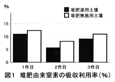 - 堆肥連用土壌の場合、1作目には堆肥中窒素成分の 10.9%が、2作目には 5.6%が、3作目には 9.0%が吸収され、3作で合計25.5%が吸収利用される。 堆肥無施用土壌の場合、1作目には 12.3%、2作目には 8.1%、3作目には 10.9%、3作で合計31.3%が吸収利用される(図1)。