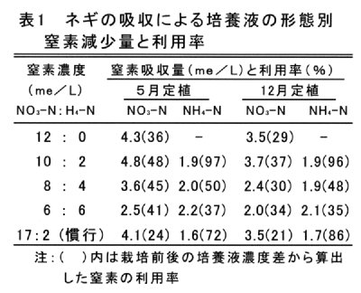 - 島根県でネギの養液栽培に使用される培養液(慣行)では、硝酸態窒素(NO3 -N)の利用率は20~25%、アンモニア態窒素(NH4 -N)は70~90%程度と推定される。NO3 -Nの濃度をさげても利用率が上昇するため、10me/L以上の濃度であればネギによる吸収量は慣行培養液を上回る。NO3 -N濃度を10me/LにするとNH4 -Nの利用率はさらに上昇し、2me/LのNH4 -Nはほぼ全量が吸収される(表1)。