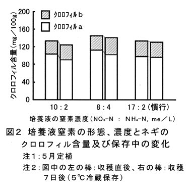- ネギの生育、収量は、培養液中の総窒素濃度を慣行より3割減らして12me/Lにしても、NH4 -N濃度が2~4me/Lであれば、5月、9月及び12月定植のいずれの作型とも慣行と差がない(図1)。また、収穫直後及び 5℃で1週間冷蔵保存後のクロロフィル含量にも慣行との差が認められず、葉色や保存性に問題はない(図2)。