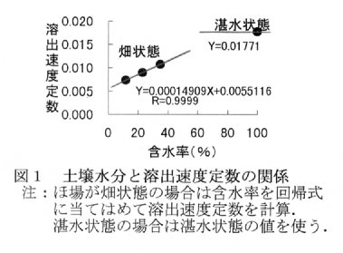 - 窒素溶出速度定数(k)は土壌水分と密接な関係にあり、図1の回帰式から任意の土壌水分におけるkの値を知ることができる。