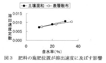 - 被覆肥料を土壌表層に散布した場合と土壌中に混和した場合で、溶出速度は余り変わらない(図3)。