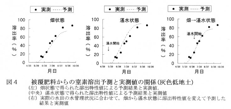 - 培養試験で得られた溶出特性値を用いて得た推定値を、ほ場の田面表層に並べた被覆肥料からの窒素溶出率を実測した値と比較したところ、施肥から湛水開始までは畑状態の溶出特性値を、それ以後は湛水状態の溶出特性値をそれぞれ用いて推定すれば実測値によく近似する(図4)。