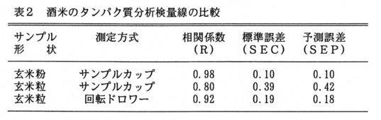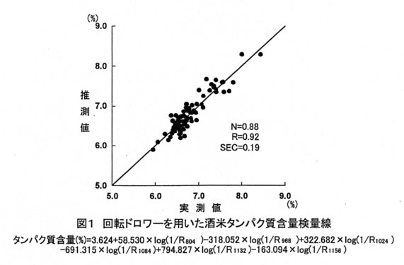 - 酒米玄米粒を回転ドロワーを装着した近赤外分光分析装置(Bran+Lubbe Infrayzer 500)を用いて検量線を採取した。検量線を採取した玄米粒をケルダール窒素蒸留法でタンパク質含量の実測値を測定した。