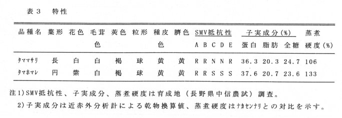 - 本県奨励品種「タマホマレ」は、栽培適性が高いため普通大豆の90%以上を占めているが、低蛋白、煮豆が硬いことなどにより需用者の評価が著しく低いため、奨励品種決定調査の中で代替品種を探索してきた。