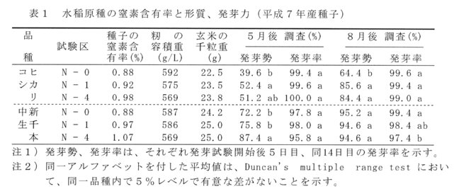- 穂肥無施用のN-0区は、穂肥標準施用のN-1区、穂肥・実肥4倍施用のN-4区に比べ、「コシヒカリ」「中生新千本」とも収穫5カ月後の発芽勢が劣るが、発芽率には差異は認められない。収穫8カ月後には、発芽勢の上昇がみられるが、「コシヒカリ」では発芽勢が低い傾向が認められる(表1)。
