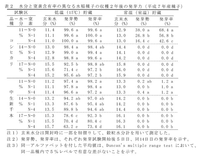 - 収穫2年後の低温貯蔵での発芽力は、穂肥の施用量よりも、水分含量の影響のほうが大きく、水分含量が低いほど発芽力は高く維持され、水分含量11%と17%との発芽率には有意な差が認められる(表2)。