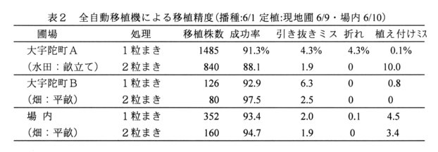 - 機械移植の適期幅はコムギによる根鉢が形成される播種後7日から、黒ダイズの草丈が15cmに達する時期(9-10日後)の間である。播種後8-9日で概ね90%以上の移植率が得られる。1セル1粒まきの苗はトレイからの引き抜きミスが、2粒まきの苗は植え穴への植付けミスが見られる(表2)。
