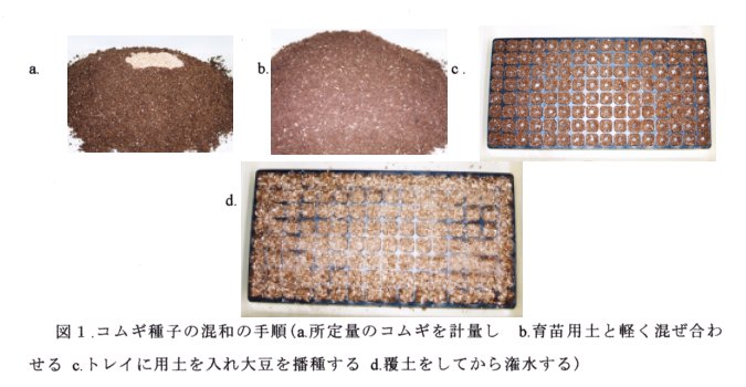 - 黒ダイズのセル育苗用土にコムギの種子を混和して使用することにより、コムギによる根鉢が形成され全自動移植機による移植精度が向上する。植え付け後のコムギは、セトキシジムなどの選択性除草剤で枯殺する。