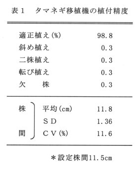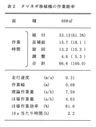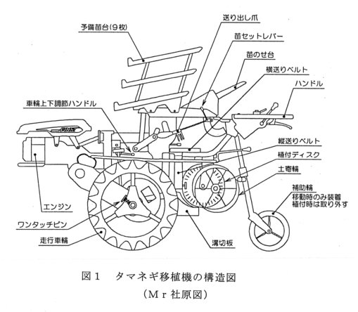 - 本機は歩行型 2条の全自動タマネギ移植機である。植付けは作溝土寄せ方式で、株間は 9.5cm~12.0cm、輪距は1.2m~1.4mまで調節できる。植付精度は極めて良好で、作業能率は2.2時間/10aと人力作業の約10倍である。