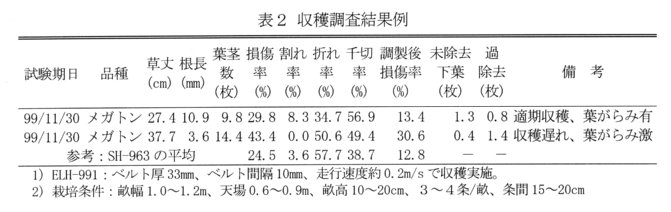 - 本機は、平成8年度の本成果情報で報告した「軟弱葉菜類収穫機(SH-963)」、及び本年度報告の「軟弱葉菜類収穫機の調製機構」を基にして、小形化・取り扱い性向上を第一目標として新たに製作した一輪式一条刈りの軟弱葉菜類収穫機(ELH-991)である。12Vバッテリを搭載し、DCモータにより走行、収穫物の搬送・調製を行う(図1、表1)。