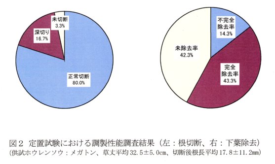 - 定置調製試験において、根調製切断機構は80%の株の根を約20mmの長さに切断できる(図2左)。また、下葉除去機構は下葉の57%を除去できる(図2右)。一方、過除去は、1株あたり0.1枚未満である。